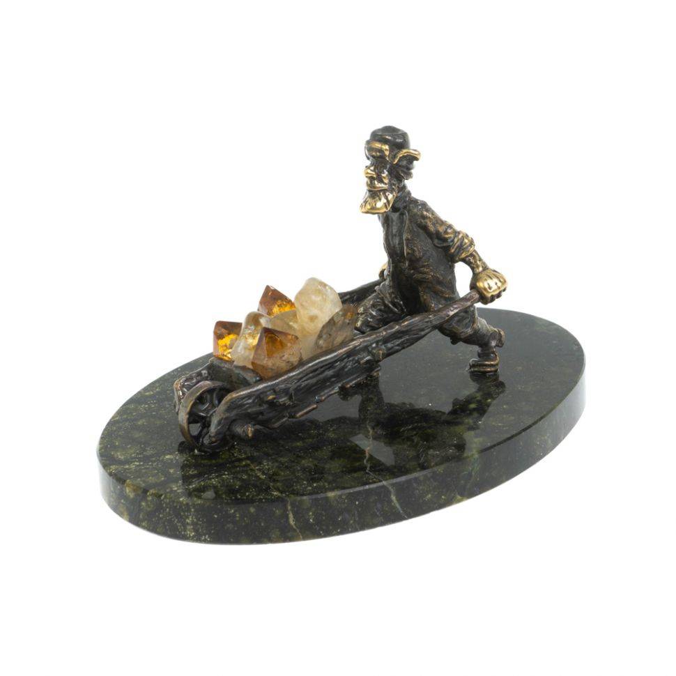Статуэтка "Старатель с тачкой" из бронзы камень цитрин | Ручка металлическая на подставке из камня цитрин |