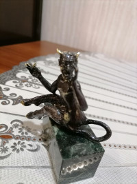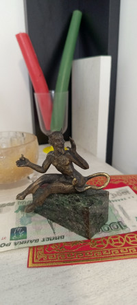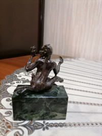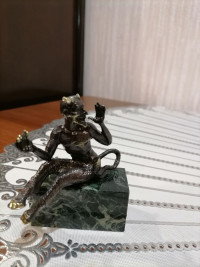 Бронзовая статуэтка "Чертик" на подставке из темно-зеленого змеевика — эксклюзивное изделие ручной работы, сочетает природную эстетику, точность обработки и художественный замысел, отличается утончённым стилем и продуманной композицией.