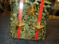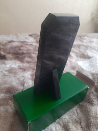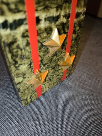 Часы изготовлены из темно-зеленого змеевика, имеют размеры 6х4х15 см и весят 300 г, просветы из виниловой пленки красного цвета, звезды металлические.