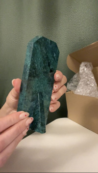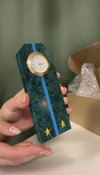 Часы изготовлены из натурального змеевика, имеют размеры 6х4х15 см и весят 300 г, просветы из оракала голубого цвета, звезды металлические.