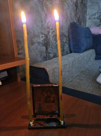 Икона настольная "Нечаянная радость" из обсидиана с подсвечниками — эксклюзивное изделие ручной работы, сочетает природную эстетику, точность обработки и художественный замысел, отличается утончённым стилем и продуманной композицией.