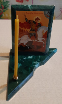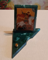 Икона с подсвечником Георгий Победоносец средняя из змеевика 12х12х13 см — эксклюзивное изделие ручной работы, сочетает природную эстетику, точность обработки и художественный замысел, отличается утончённым стилем и продуманной композицией.