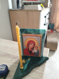 Икона с подсвечником Казанская средняя из змеевика 12х12х13 см — эксклюзивное изделие ручной работы, сочетает природную эстетику, точность обработки и художественный замысел, отличается утончённым стилем и продуманной композицией.