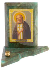 Икона с подсвечником Серафим Саровский малая из змеевика 9,5х9,5х10 см — эксклюзивное изделие ручной работы, сочетает природную эстетику, точность обработки и художественный замысел, отличается утончённым стилем и продуманной композицией.