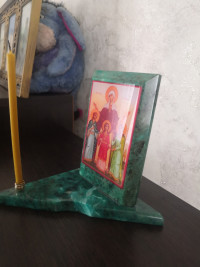 Икона с подсвечником Вера, Надежда, Любовь и мать их София средняя 12х12х13 см — эксклюзивное изделие ручной работы, сочетает природную эстетику, точность обработки и художественный замысел, отличается утончённым стилем и продуманной композицией.