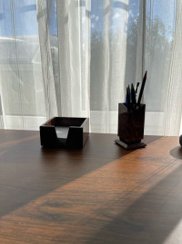 Карандашница из лемезита — эксклюзивное изделие ручной работы, сочетает природную эстетику, точность обработки и художественный замысел, отличается утончённым стилем и продуманной композицией.