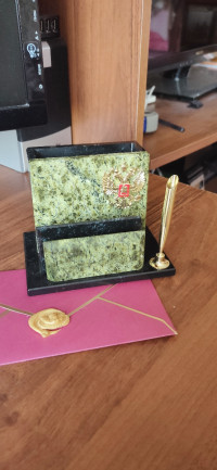 Карандашница с визитницей из змеевика — эксклюзивное изделие ручной работы, сочетает природную эстетику, точность обработки и художественный замысел, отличается утончённым стилем и продуманной композицией.