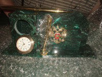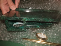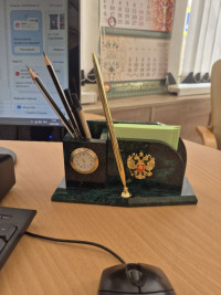 Камень пришел чуть цветом чуть темнее, чем на фото. Всё на своих местах, никакой стружки внутри часов, криво накленного герба, как у меня было в первый раз, когда брал письменный набор "Щит", который к сожалению, пришлось отправить обратно.