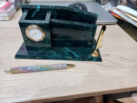 Настольный мини-набор змеевик — эксклюзивное изделие ручной работы, сочетает природную эстетику, точность обработки и художественный замысел, отличается утончённым стилем и продуманной композицией.
