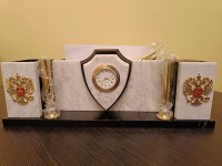 Настольный набор из мрамора "Щит" станет изысканным подарком на юбилей, корпоратив, профессиональный праздник или важное событие. Каждый товар поставляется в подарочной упаковке, полностью готов к вручению.