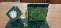 Настольный набор из змеевика с иллюстрацией под малахит — эксклюзивное изделие ручной работы, сочетает природную эстетику, точность обработки и художественный замысел, отличается утончённым стилем и продуманной композицией.