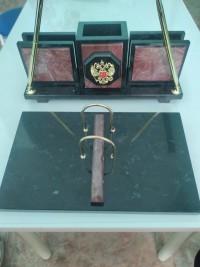 Настольный набор "Офисный" с гербом РФ из камня лемезит — эксклюзивное изделие ручной работы, сочетает природную эстетику, точность обработки и художественный замысел, отличается утончённым стилем и продуманной композицией.