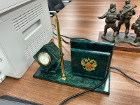 Письменный набор "Герб РФ" камень змеевик — эксклюзивное изделие ручной работы, сочетает природную эстетику, точность обработки и художественный замысел, отличается утончённым стилем и продуманной композицией.