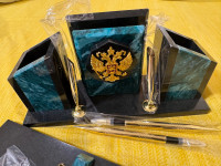 Письменный набор "Канцелярский" с гербом камень змеевик станет изысканным подарком на юбилей, корпоратив, профессиональный праздник или важное событие. Каждый товар поставляется в подарочной упаковке, полностью готов к вручению.