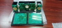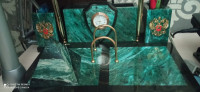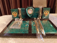 Письменный прибор «Щит» изготовлен из природного змеевика с Южно-Шабровского месторождения (Свердловская область). Этот минерал ценится за свой благородный зелёный оттенок, характерный рисунок и прочность. Комплект включает всё необходимое для организации рабочего стола: подставку с двумя шариковыми ручками, часы, перекидной календарь и декоративные дуги.