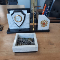 Подставка для скрепок из мрамора размером 9х9х3,5 см и весом 350 г.