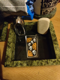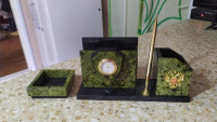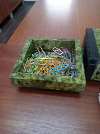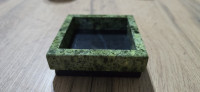 Подставка для скрепок из змеевика размером 9х9х3,5 см и весом 350 г.