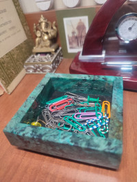 Подставка под скрепки из змеевика — эксклюзивное изделие ручной работы, сочетает природную эстетику, точность обработки и художественный замысел, отличается утончённым стилем и продуманной композицией.