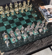 Набор для игры в шахматы "Древний Рим" изготовлен вручную, доска из натурального камня, шахматные фигуры металлические в цвете золото и серебро.