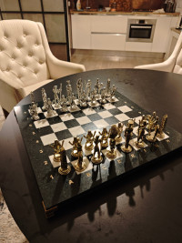 Шахматный набор изготовлен вручную, доска из натурального камня, фигуры из металла в цвете золото и серебро.