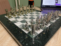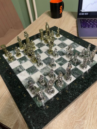 Шахматный набор "Рыцари" изготовлен вручную, доска из натурального камня, фигуры из металла в цвете золото и серебро.