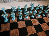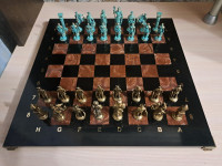Шахматный набор "Римляне против Галлов" изготовлен вручную, доска из натурального камня, фигуры из металла в цвете бронза и патина.