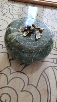 Шкатулка из змеевика "Желуди" 15х15х9 см сочетает в себе функциональность и художественную ценность. Каменная текстура придаёт каждой шкатулке уникальный рисунок, а бронзовые элементы дополняют её благородным блеском. Лаконичные формы делают модель универсальной — она гармонично впишется в классический или современный интерьер.