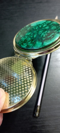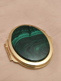 Зеркало из малахита овальное карманное цвет золото — эксклюзивное изделие ручной работы, сочетает природную эстетику, точность обработки и художественный замысел, отличается утончённым стилем и продуманной композицией.