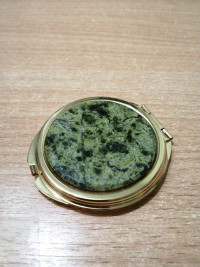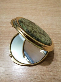 Зеркало карманное круглое со змеевиком, золотистое — эксклюзивное изделие ручной работы, сочетает природную эстетику, точность обработки и художественный замысел, отличается утончённым стилем и продуманной композицией.