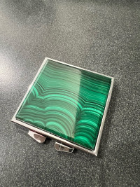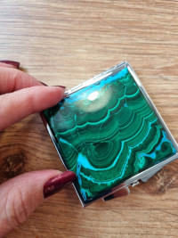 Зеркало квадратное карманное из малахита цвет серебро — эксклюзивное изделие ручной работы, сочетает природную эстетику, точность обработки и художественный замысел, отличается утончённым стилем и продуманной композицией.