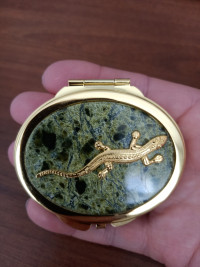 Зеркальце овальное из змеевика с прямой ящерицей цвет золото — эксклюзивное изделие ручной работы, сочетает природную эстетику, точность обработки и художественный замысел, отличается утончённым стилем и продуманной композицией.